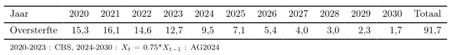 De oversterfte volgens het CBS in de jaren 2020-2023 is bekend. Na 2023 laten we de oversterfte afnemen met de in AG2024 gebruikte 25%. De totale oversterfte van 2020-2030 komt dan uit op 91,7 duizend.
