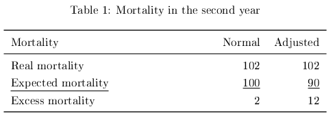 An example of the first effect. In a village 100 people die every year. In a year 10 extra people die from a heavy flu who would otherwise have died in he next year. Mortality is then 110. Thus the excess mortality is 10. Then in the following year 10 from an expected 100 have died a year earlier, Hence it is expected that in that year 90 people will die, 10 less than normal. Suppose that in the second year 102 people die. Then the excess mortality is 12, not 2. See table 1.