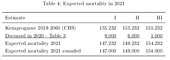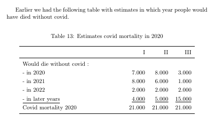 At first sight this might seem inaccurate. We can however deduce more than it seems. The totals have to add up to 21 thousand. Hence when we lower the estimate in one year, then we have to increase the estimate in another year (or years). In appendix A I give an example of this waterbed effect over two years. We notice that the combined excess mortality from the two years remains equal. The change in the estimate in one year is compensated in the other year. So, suppose an estimate for a specific year is questioned. Then one has to give an estimate for all the years with the same total combined. In table 3 there are three estimates for 2020.