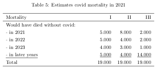 In 2021 19 thousand people died from covid (CBS, 2022). I estimate that from these five thousand people would have died also in 2021 without covid (table 5: estimate I). Then the excess mortality due to covid is 14 thousand. The excess mortality by other causes than covid becomes two thousand (CBS) and ten thousand. See table 7.