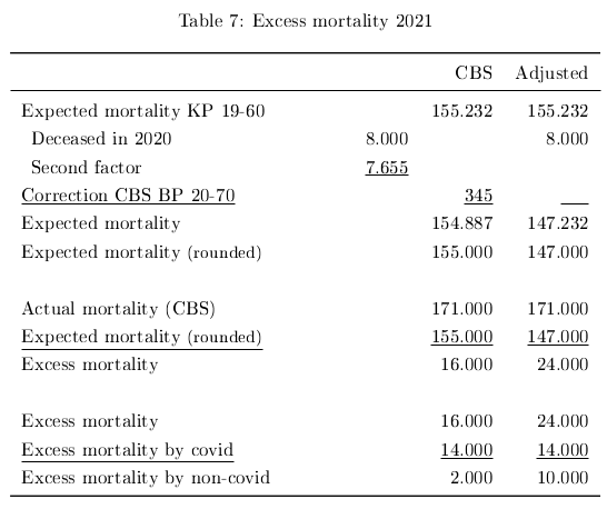 In the paragraphs 4-7 are the consequences per year. These are numbers pertaining expected mortality, excess mortality, distinction between covid and non-covid, excess mortality within the year and total excess mortality. Those numbers are compared to those from the CBS.