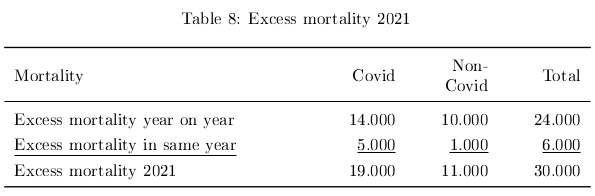 In 2021 the adjusted excess mortality on an annual base was 24 thousand. I estimate that five thousand people died early by covid who, without the pandemic, would have died later that year (table 3: estimate I). This is excess mortality in the year. There were also people who died early by other causes than covid but would otherwise have died later that year. This might for example be because of postponed medical treatment. How many is difficult to estimate. For this paper I assume their number to be one thousand. Then the total excess mortality in 2021 equals 30 thousand people (24+5+1). Or, otherwise calculated, 19 thousand people died prematurely from covid and eleven thousand from other causes. See table 8.