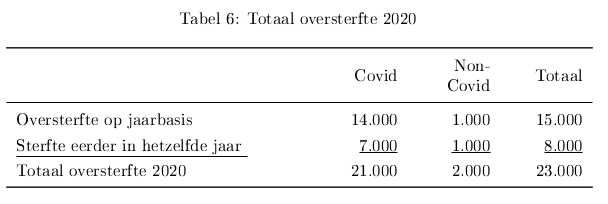 Stel dat duizend mensen door andere oorzaken eerder dan verwacht, maar wel in het zelfde jaar, zijn overleden. Dit zijn bijvoorbeeld ouderen in verzorgingstehuizen die geen bezoek mochten ontvangen en daardoor psychisch leden en eerder stierven. Dit is realistisch maar we hebben geen cijfers hierover. Ik gebruik als schatting het laagst mogelijke duizendtal, dus één duizend. De totale oversterfte in 2020 wordt dan 23 duizend (15+7+1). Zie tabel 6.