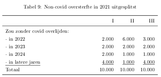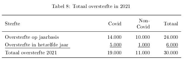 In 2021 was de aangepaste oversterfte op jaarbasis 24 duizend. Daarnaast schat ik dat vijfduizend mensen eerder in het jaar door covid zijn overleden die zonder pandemie later in het jaar zouden zijn overleden. Dit voortijdig overlijden is oversterfte binnen het jaar. Er zijn ook mensen eerder dan verwacht, maar wel in hetzelfde jaar, aan andere oorzaken dan covid coverleden. Bijvoorbeeld door uitgestelde medische behandeling en/of psychische problemen. De grootte van deze groep is moeilijk te schatten. Voor deze berekening stel/schat ik deze groep op duizend mensen. Dan komt de totale oversterfte in 2021 uit op 30 duizend (24+5+1). Of, anders berekend, 19 duizend mensen zijn voortijdig aan covid overleden en elfduizend voortijdig aan andere oorzaken. Zie tabel 8.