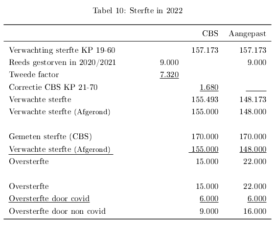 In 2022 was de aangepaste oversterfte op jaarbasis 22 duizend. Daarnaast zijn er tweeduizend mensen die door covid eerder dan verwacht, maar wel in het zelfde jaar, zijn overleden. Er zijn ook mensen eerder dan verwacht, maar wel in hetzelfde jaar, aan andere oorzaken dan covid overleden. Bijvoorbeeld door tekort aan medische zorgen/of extra psychische problemen. De grootte van deze groep is moeilijk te schatten. Voor deze berekening stel/schat ik deze groep op duizend mensen. Dan is de totale oversterfte in 2022 dus 25 duizend (22+2+1). Of, anders berekend, achtduizend mensen zijn voortijdig aan covid overleden en 17 duizend aan andere oorzaken. Zie tabel 11.