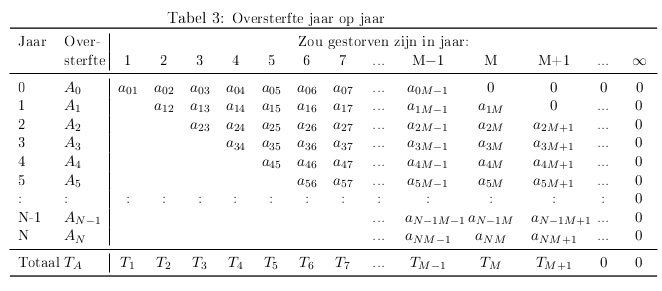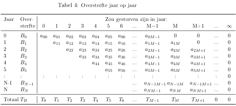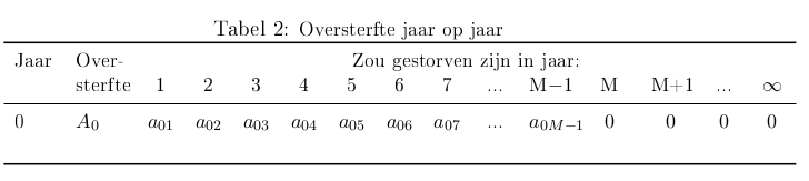 M is de maximum leeftijd die men kan bereiken. Als men geboren is in het jaar 0 dan kan men maximaal leven tot en met het jaar M-1. Dan is de waarde in deze rij vanaf M gelijk aan 0.