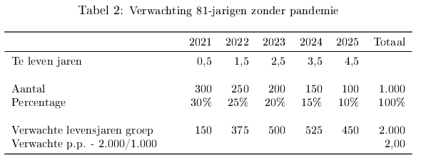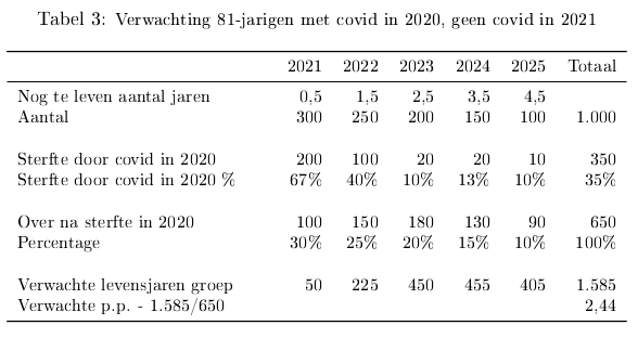 Nu is sprake van covid. Neem aan dat in 2020 de covid pandemie de enige verstorende factor was. We bepalen de verwachte sterfte voor 2021 op 1-1-2021 bepalen alsof in 2021 geen covid of andere verstorende factor was. De sterfte in 2020 heeft gevolgen voor de verwachte sterfte in 2021, dus die betrekken we in de berekeningen. Stel dat 350 mensen uit de groep van duizend in 2020 zijn overleden aan covid. Dus er blijven 650 over op 1-1-2021. Door covid stierven de zwakkeren, degenen met de laagste levensverwachting, het eerst. Stel dat van de verwachte sterfte van 300 voor 2021 uit de situatie zonder covid 200 mensen zijn overleden. Dan overlijden 100 van de resterende 650 mensen in 2021 en 550 in latere jaren. De procentuele sterfte in 2021 is dan (100 : 650) x 100 %= 15.4%. Als de verwachte sterfte van deze groep bepaald wordt op basis van historische cijfers dan krijgen we een verwachte sterfte van 30% x 650 = 195. Dat is een overschatting. Het historisch percentage is een correctie voor volume, maar houdt geen rekening met de gewijzigde samenstelling van de leeftijdsgroep. Hiervoor moeten de cijfers gecorrigeerd worden. In dit geval moet de verwachte sterfte van deze groep verlaagd worden van 195 naar 100. Zie tabel 1.